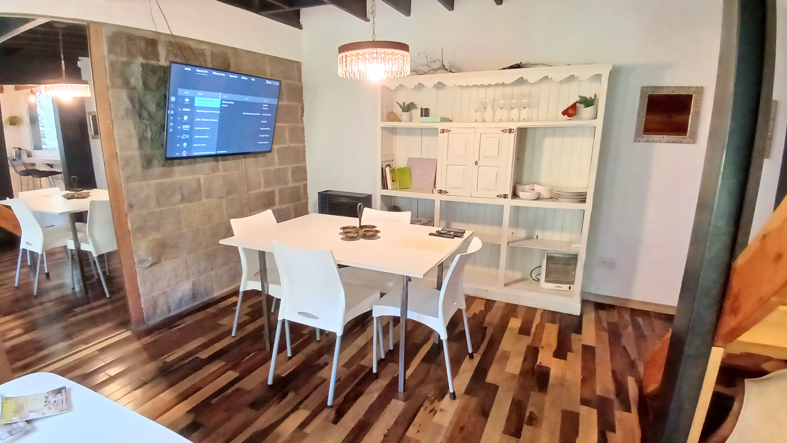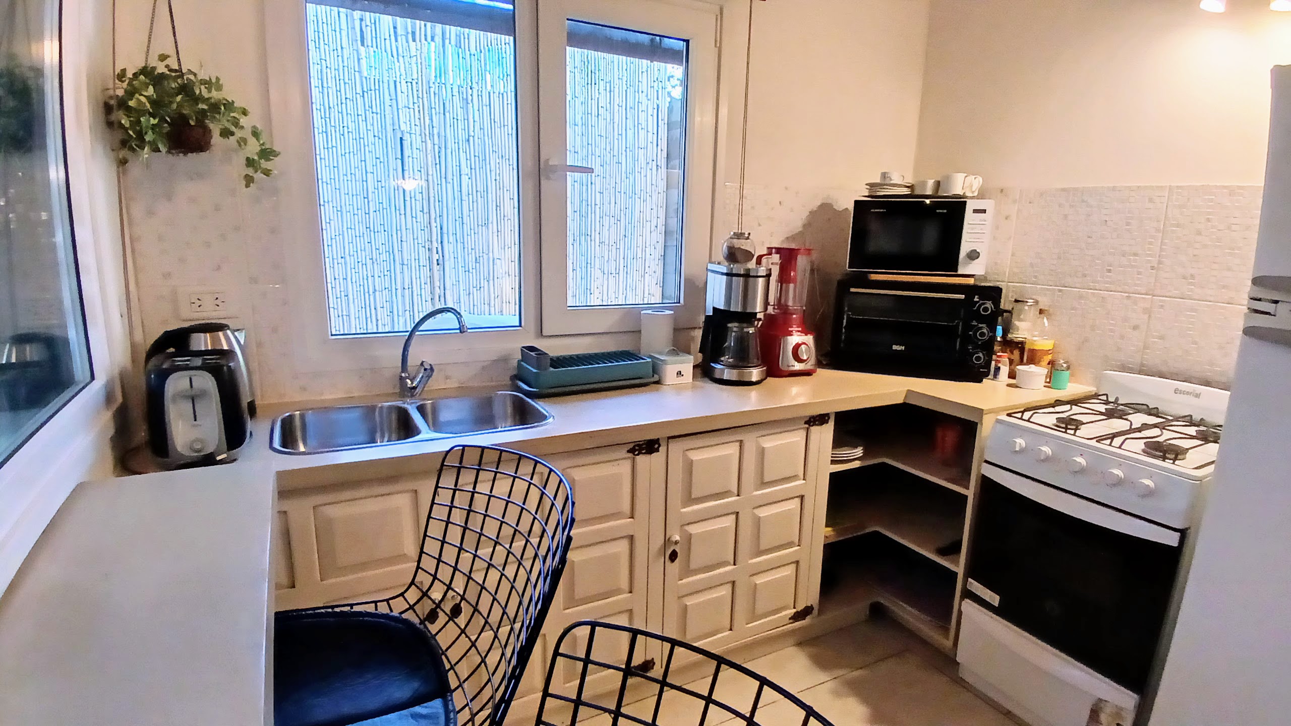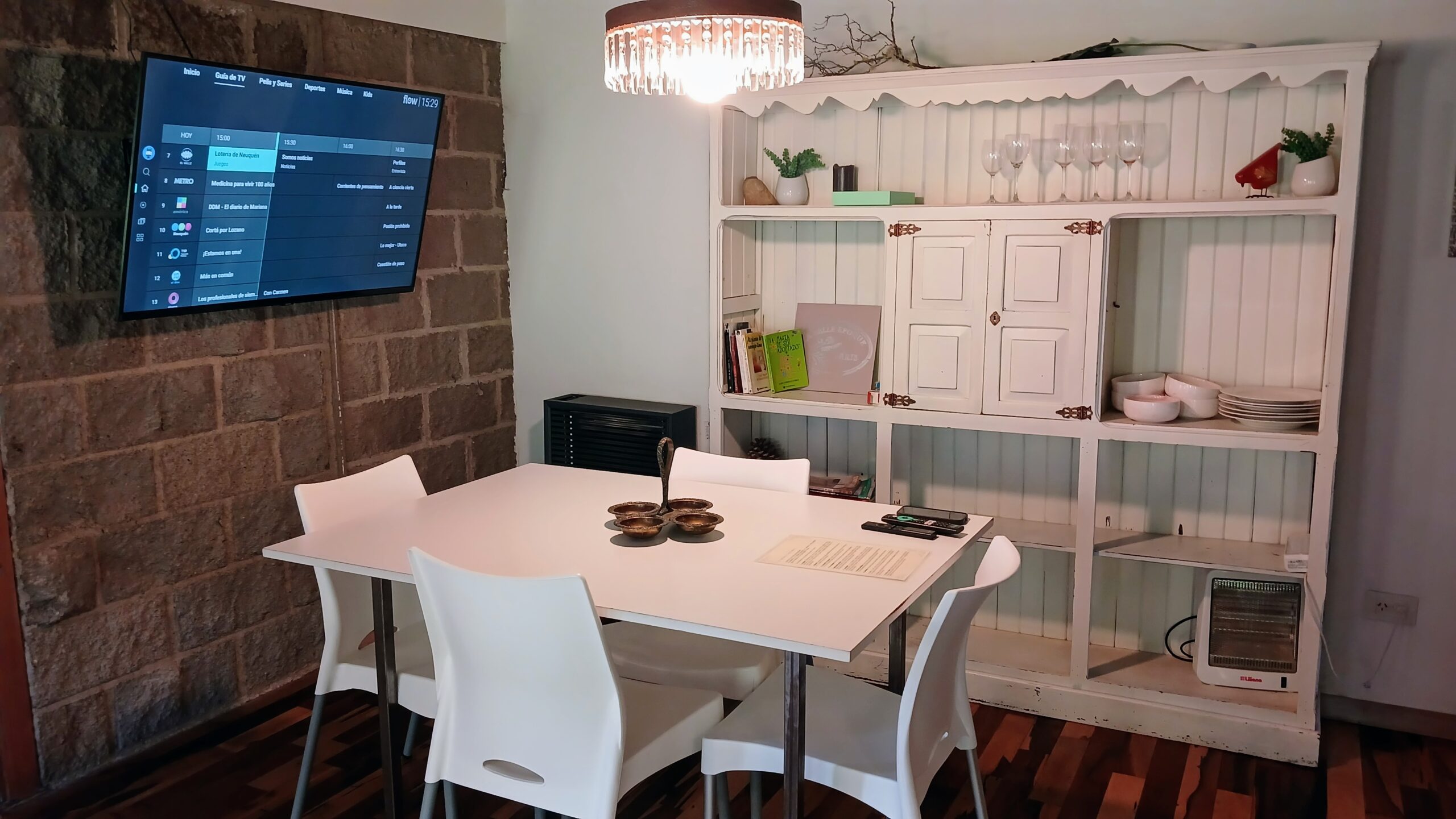 Cocina, barra, cama matrimonial, comedor, baño, lavarropas, tv con Flow, wifi, alarma, elementos de cocina, vajilla, microondas.